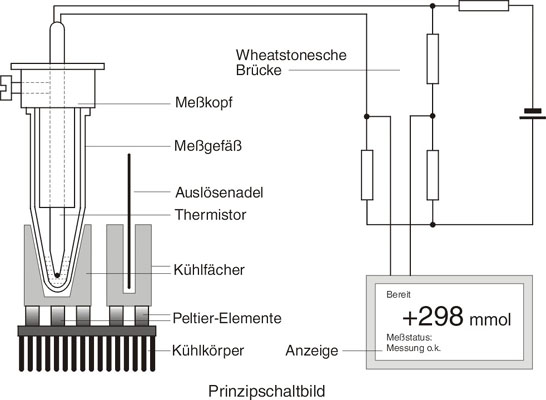 Bei Löser-Kryometern wird die Wärme über Kühlflächen an die Luft abgegeben, ein Wasseranschluß ist nicht erforderlich. Somit ist für den Betrieb lediglich eine Steckdose nötig. Die Temperatur der kalten Seite wird elektronisch konstant gehalten. Während der Messung wird die Temperatur in der Probe von einem Thermistor (ein temperaturabhängiger Widerstand) gemessen. Dieser ist Bestandteil des Meßkopfes, an den das Meßgefäß gesteckt wird. Der Meßkopf ist an einer Führung befestigt, wo er vor unbeabsichtigter Beschädigung geschützt ist. Bei einer definierten Unterkühlung wird der Gefriervorgang ausgelöst, indem eine Nadel mit Eiskristallen in die Probe eingetaucht wird. Es stellt sich nun der Gefrierpunkt der Lösung ein. Die Methode des Auslösens ist entscheidend für die Reproduzierbarkeit der Messungen. Das kurzzeitige Eintauchen einer Nadel mit Eiskristallen ergibt genauere Meßergebnisse, als das Rühren mit einem ständig in die Probe eintauchenden Draht. Wegen des linearen Zusammenhanges zwischen Molalität und Gefrierpunkt ist die Messung der Gefriertemperatur auch eine Messung der Molalität. Daher werden mmol / kg Benzol direkt angezeigt. |