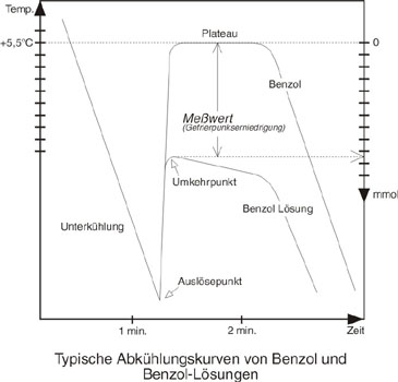 MeßprinzipEs wird der Gefrierpunkt von benzolhaltigen Lösungen gemessen. Die Gefrierpunktserniedrigung im Vergleich zum reinen Benzol stellt ein direktes Maß für die molale Konzentration dar. Reines Benzol gefriert bei +5,5°C, eine benzolhaltige Lösung mit einer Molalität von 1 mol / kg Benzol bei +0,38°C. 1 Mol Substanz in einem kg Benzol gelöst, ergibt nur dann eine Lösung mit der molalen Konzentration von 1 mol / kg Benzol, wenn es eine ideale Lösung ist und wenn die Substanz nicht dissoziiert.Wirkungsweise und Beschreibung |