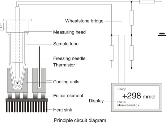 Measuring PrincipleThe freezing point of benzene solutions is measured. The freezing point depression in comparison to pure benzene is a direct measure of the molale concentration. Pure benzene freezes at +5.5°C; an benzene solution with an molality of 1 mol / kg benzene freezes at +0.38°C. 1 Mol of a substance dissolved in 1 kg of benzene gives a solution with a molale concentration of 1 mol / kg benzene only if it is an ideal solution and if the substance does not dissociate.Function and Description |