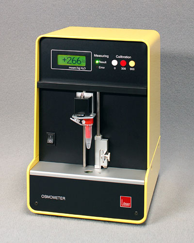 Special Features and Advantages- Very small sample volumes possible. - Cost effective solution for users with smaller numbers of samples.- Measurements shown on a wide illuminated LCD display. - Automatic result recognition and storing ensure reliable measurings. - User guiding and error messages with lamps and display. - User friendly push button calibration prevents calibration error. - Additionally third calibration point at 900 mosm provides increased accuracy at higher concentrated solutions. - Single use plastic tubes. - Reduced operating costs as no extra water supply is necessary and power consumption is low. Operating of the Instrument- Switch on instrument, wait for ready display (approx. 3 minutes). View Video - Place 100 µl sample in the sample tube (± 10 %). - Place the sample tube onto the measuring head. - Lower the measuring head. The sample tube is dipped into the cooling slot. - Superercooling is reached after 1 minute and the instrument gives an audible tone. The user dips the needle with ice crystals shortly into the sample and starts the freezing manually. - The freezing point will be reached, the display shows the measurement value in mosm / kg. The measuring value will be automatically detected and stored until the next measuring is started. A buzzer sounds and the "Ready" lamp shines. - Slide measuring head from cooling slot and remove the sample tube. - Wipe the thermistor with a soft tissue. Extra Accessories:- Analogue output for XY-plotter- Calibration solution 300 and 900 mosm / kg H2O Subject to technical changes. Brochures and EnquiryField of Applications for OsmometersBasics about Osmometry |