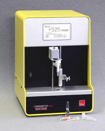Special Features and Advantages and new Functions- Very small sample volumes possible.- Menu led operation on a wide illuminated LCD graphic display with touch operation (view video). - Selectable languages. (German, English, French, Spanish, Portuguese, Swedish, Italian). - Statistical review of measuring data (MV/SD/CV). - LOT-function for automatic input of sample numbers. - Code protection (view Video) with Log-In user administration for GLP-Assistance. - Instrument-ID free configurable for identification to GLP-Assistance. - Variable 2nd and 3rd calibration points. - Single use plastic tubes. - The parameters for baudrate, parity and flow control of the RS232 interfaces can be configured via the menu. - Wide input voltage range 100-230VAC suitable for all countries - Reduced operating costs as no extra water supply is necessary and power consumption is low. - MS-Windows software for measuring data transfer will be included. Operating of the Instrument- Switch on instrument, wait for ready display (approx. 3 minutes). View Video - Place 25 µl sample in the sample tube (± 10 %). - Place the sample tube onto the measuring head. - Lower the measuring head. The sample tube is dipped into the cooling slot. - Enter sample number using the touch display. These entries can also be made after measurement. - Superercooling is reached after 1 minute and the needle with the ice crystals is dipped into the sample. - As freezing point is reached, the display shows the measurement value in mosm / kg and the instrument gives an audible tone. The measurement value is stored in the memory. - Slide measuring head from cooling slot and remove the sample tube. - Wipe the thermistor with a soft tissue. System access with code protectionAccess to instrument could be code protected if wanted. Mark menu point, activate protection, create user and follow instructions. With code protection you are able to prevent that every user could take control of your Osmometer or change system settings (like date/time) . Choosing access code: Access code could have 1 to 12 numbers. You are able to delete users and turn log-in off. Extra Accessories:- Analogue output for XY-plotter - Calibration solution 300 and 900 mosm / kg H2O - Reception/Processing of the measuring data with a Laboratory Information System (database) is on request and in cooperation with the system manufacturer in general possible.Subject to technical changes. Brochures and EnquiryField of Applications for OsmometersBasics about Osmometry |